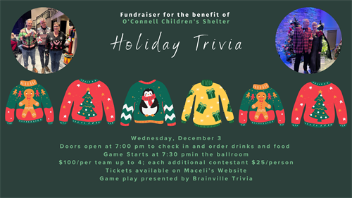 Make up a team with other party goers, play solo, recruit a ringer or two! Whatever works for you, we just want to have a good time and support O'Connell Children's Shelter. Brainville Trivia is customizing a holiday game just for us!