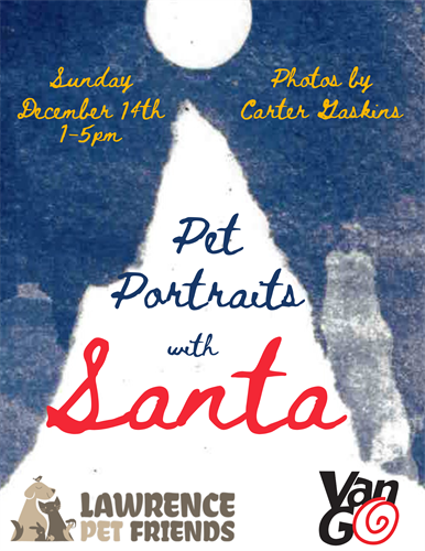 In partnership with Lawrence Pet Friends, Van Go is delighted to offer free pet portraits with Santa! Come to Van Go, 715 New Jersey Street, between 1pm and 5pm on Sunday, December 14 and get a photo of your best fur-buddy with the big man himself. Photographer Carter Gaskins will be on hand to take these free photos. Donations are always welcome and will benefit Van Go’s arts-based employment programs for 14-24 year old youth in our community.
